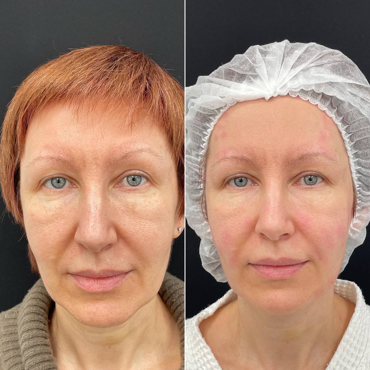 Первый результат заметен сразу после процедуры. Через 21 день начинает интенсивно вырабатываться новый коллаген, обеспечивая длительный эффект. В результате заметно подтягиваются «брыли», приподнимаются брови, носогубные складки становятся менее выражены, шрамы от акне и растяжки разглаживаются, уменьшаются, выравнивается цвет лица: тени под глазами светлеют, желтый оттенок сменяется розовым.